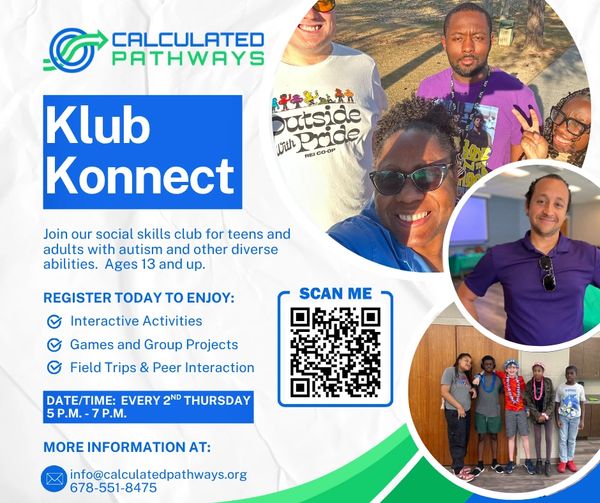 Klub Konnect is a monthly, fun, inclusive social skills club designed for teens, and adults with with disabilities, including autism and other neurodivergent conditions. Through interactive activities, games, group outings, and peer engagement, members build friendships, boost confidence, and develop important life and communication skills in a safe, supportive environment for only $10 per monthly session.